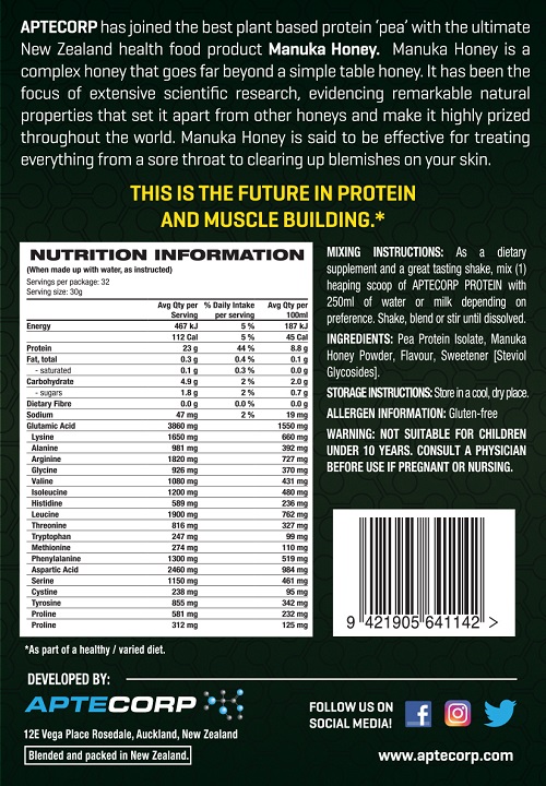Aptecorp have joined the best plant based protein ‘pea’ with the ultimate New Zealand health food product Manuka Honey. Manuka Honey is a complex honey that goes far beyond a simple table honey.